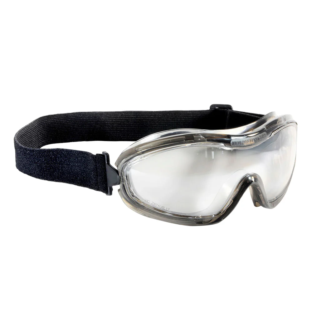 Antiparra de policarbonato con marco de PVC hipoalergénico y correa ajustable. Diseño ergonómico con ventilación indirecta, protección antiempañante y filtro UV. Ideal para ambientes industriales, construcción y minería.