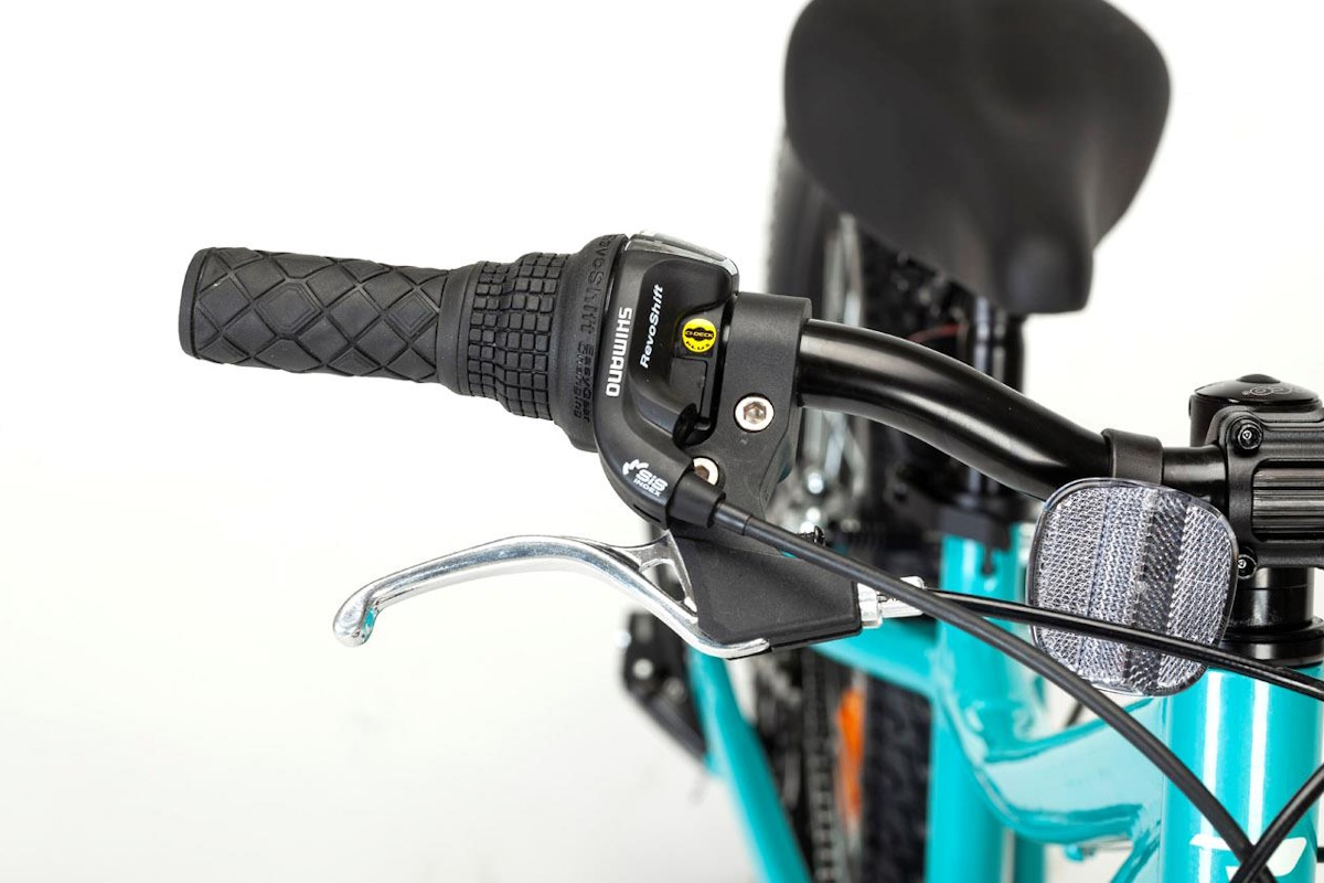 La horquilla de suspensión MS‑124 filtra baches y piedras pequeñas, aportando comodidad y control en caminos irregulares. El cambio Shimano Tourney de 6 velocidades, accionado con mando giratorio Revoshift, permite adaptar el pedaleo a subidas y llanos con mucha facilidad.