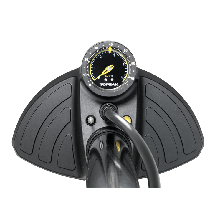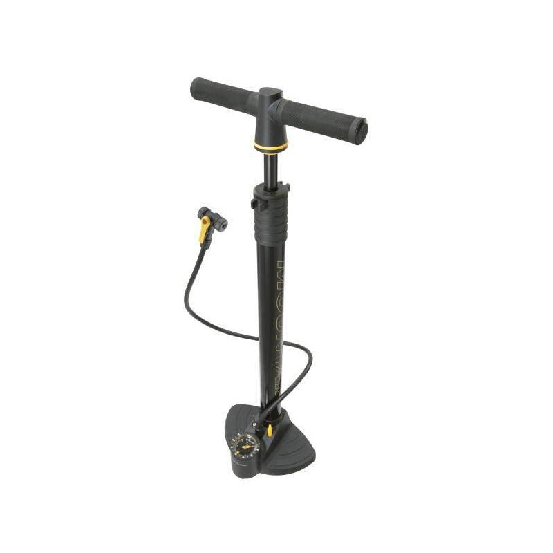 Esta exclusiva bomba de suelo para bicicleta de montaña cuenta con un depósito de acero de gran tamaño diseñado para entregar el mayor volumen requerido de neumáticos grandes todo terreno y un indicador analógico montado en la base extra sensible con botón de liberación de aire para ayudar a marcar la presión exacta. Un TwinHead ™ con manguera extra larga, puños acolchados de gran tamaño y una base estable, completan esta completa bomba.
