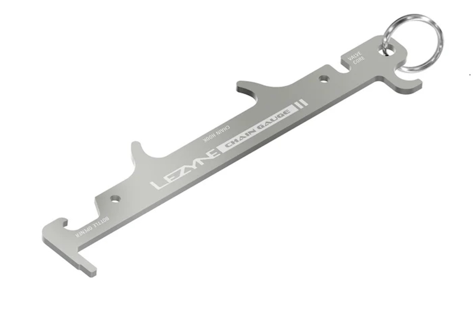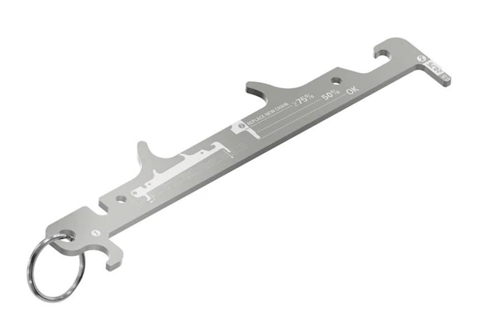 Sencillo y elegante, el Chain Gauge es un comprobador de cadena de bicicleta multifunción que cuenta con un gancho de cadena integrado y un indicador de desgaste, así como una práctica herramienta para quitar el obús de la válvula. Compatible con la mayoría de las cadenas de bicicleta de 8/9/10/11/12 velocidades y mecanizado con precisión para una precisión superior, el Chain Gauge es una póliza de seguro de acero inoxidable contra el desgaste prematuro de la transmisión. Cuélguelo cerca de su soporte de reparación con el anillo incluido para que nunca pase demasiado tiempo sin volver a comprobar el desgaste de la cadena; ¡solo no olvide volver a colocarlo después de abrir una cerveza fría con el abridor de botellas integrado!