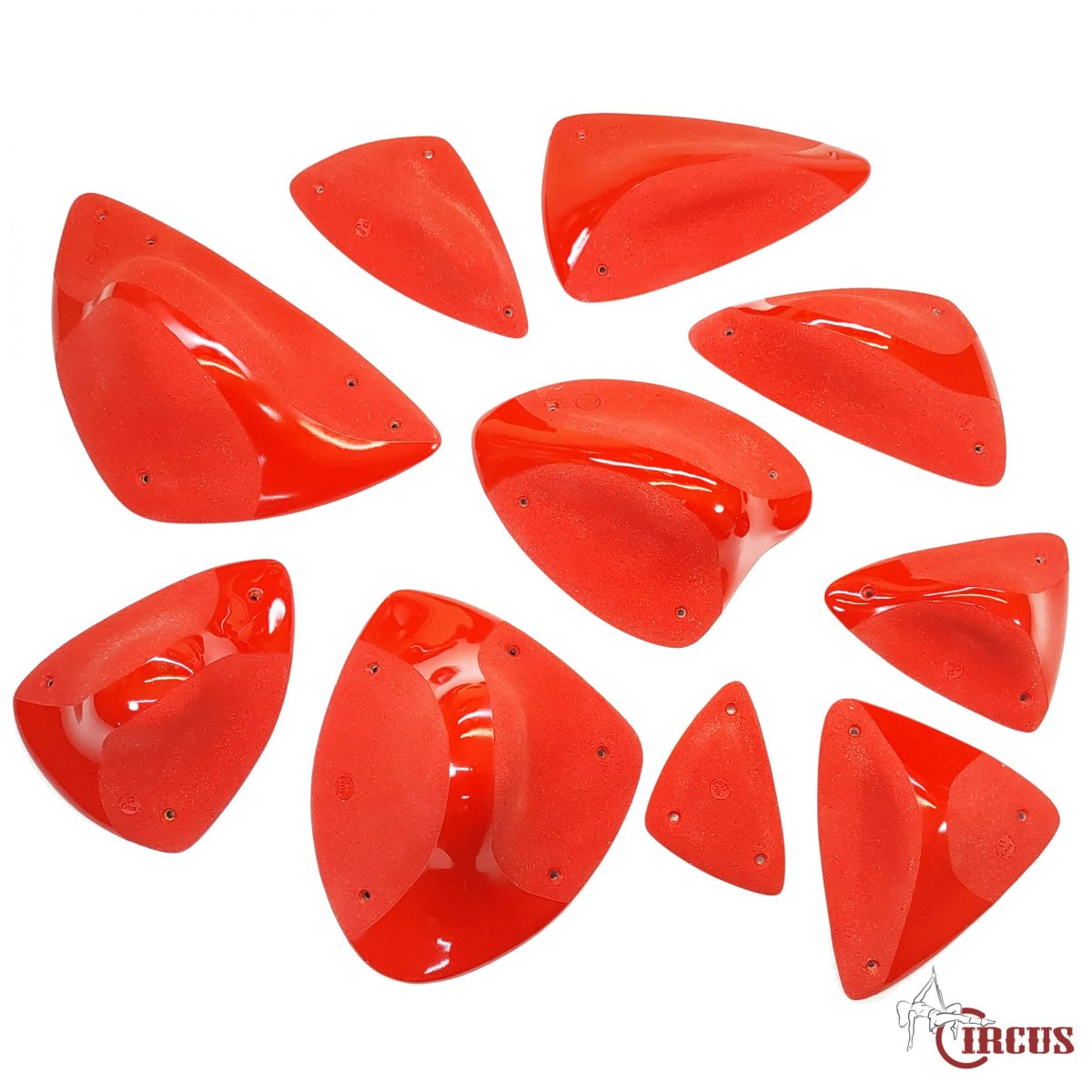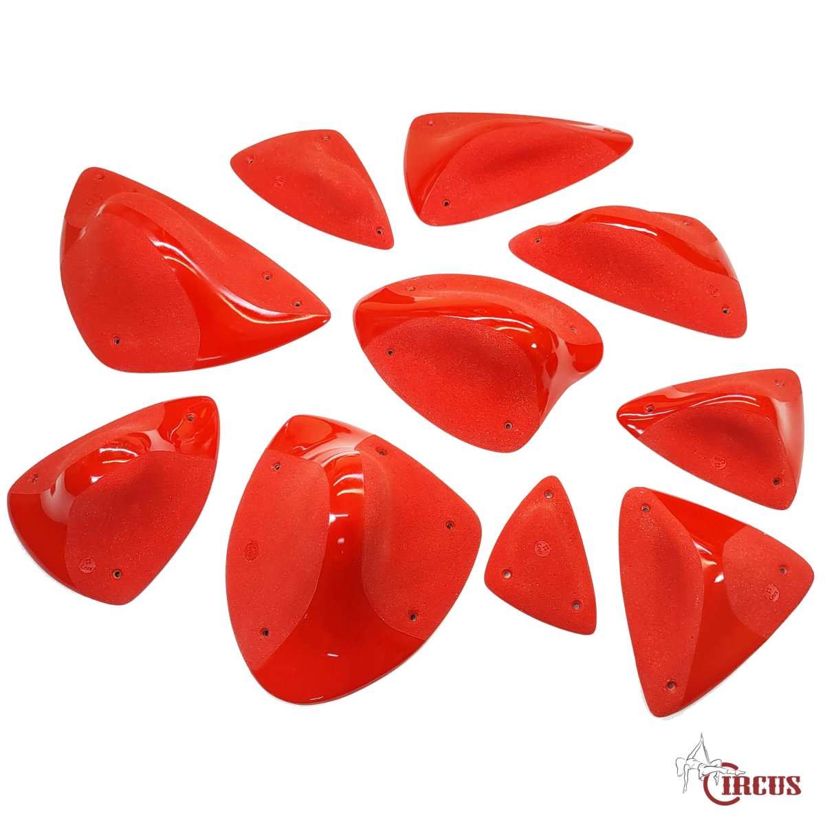 El Circus es uno de los sets más completos de Crux, la marca de presas brasileña de Felipe Camargo. Diez piezas ideales para equipar bloques técnicos, de agarres romos, en slabs e inclinaciones no muy severas. Los detalles en doble textura aportan al juego calidad estética y dan rienda suelta a la imaginación y creatividad de los routesetters.