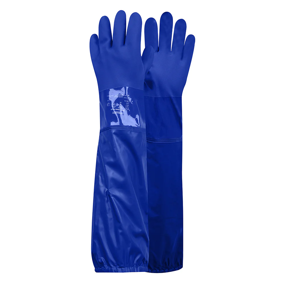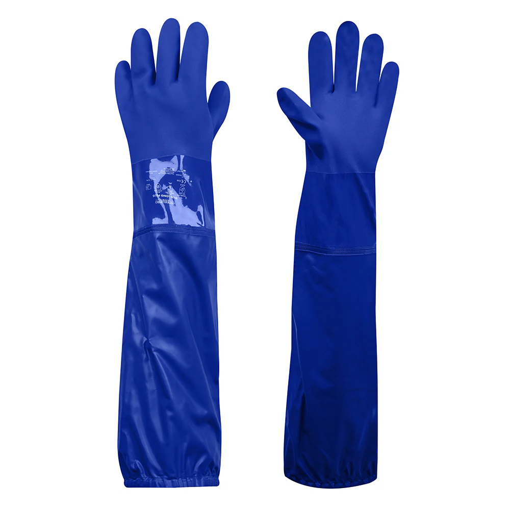 El Guante Blue Long plus con triple baño de PVC, repelente al agua, con protección química con mangas adheridas extendidas y terminación andiselizante que proporciona un agarre excepcional ya sea en ambientes secos o humedos.