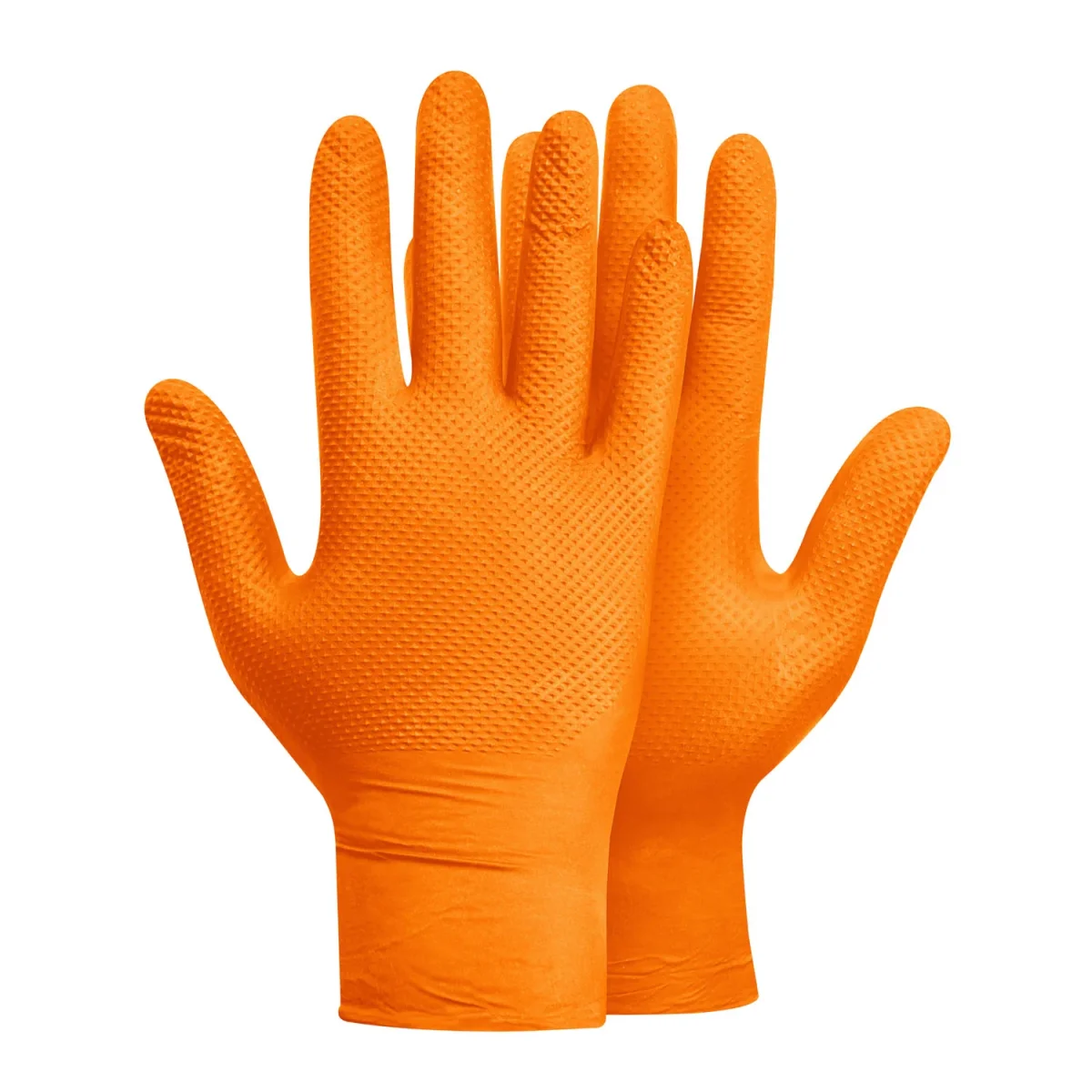 Guante de nitrilo naranjo texturizado diamantado de 8 gramos, diseñado para brindar alta resistencia, durabilidad y excelente agarre. Su color naranjo no solo aporta alta visibilidad, facilitando la detección de las manos en ambientes de riesgo, sino que también permite identificar rápidamente posibles roturas o daños en el guante, reduciendo así el riesgo de contaminación o accidentes. Gracias a su fabricación 100% en nitrilo y su textura antideslizante, ofrece un excelente agarre incluso en superficies húmedas o aceitosas. Ideal para la industria automotriz, faenas industriales, minería, talleres, limpieza pesada y manipulación de alimentos, este guante combina resistencia, seguridad y comodidad en una sola pieza. Además, cuenta con tecnología touch, permitiendo el uso de pantallas y dispositivos móviles sin necesidad de retirarlo. Su empaque individual es una caja de 100 unidades (50 pares).