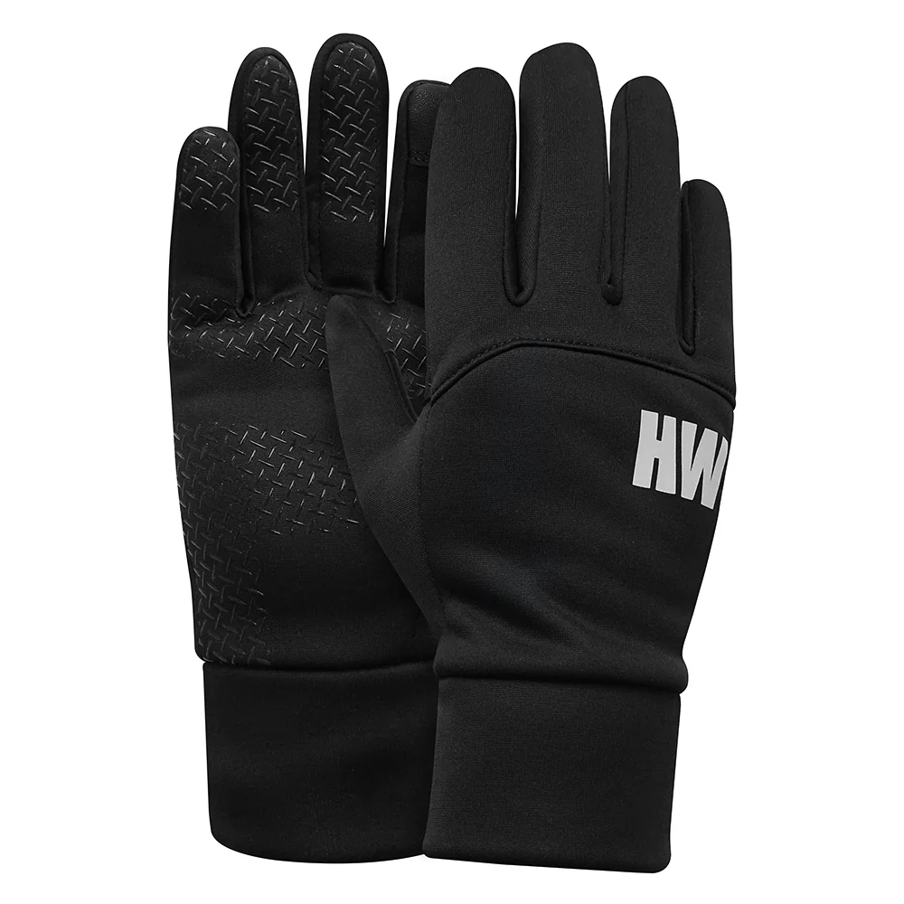 Guante térmico de color negro, logo reflectivo, tela touch en los dedos índice y pulgar para mayor comodidad de usar el teléfono, antideslizante de impresión de silicona, forro de polar.