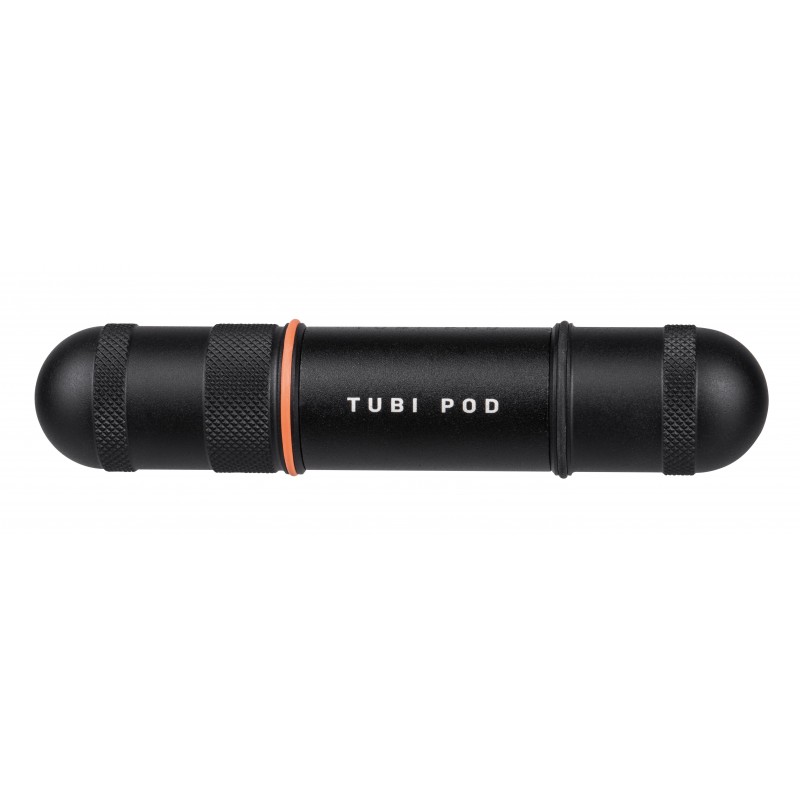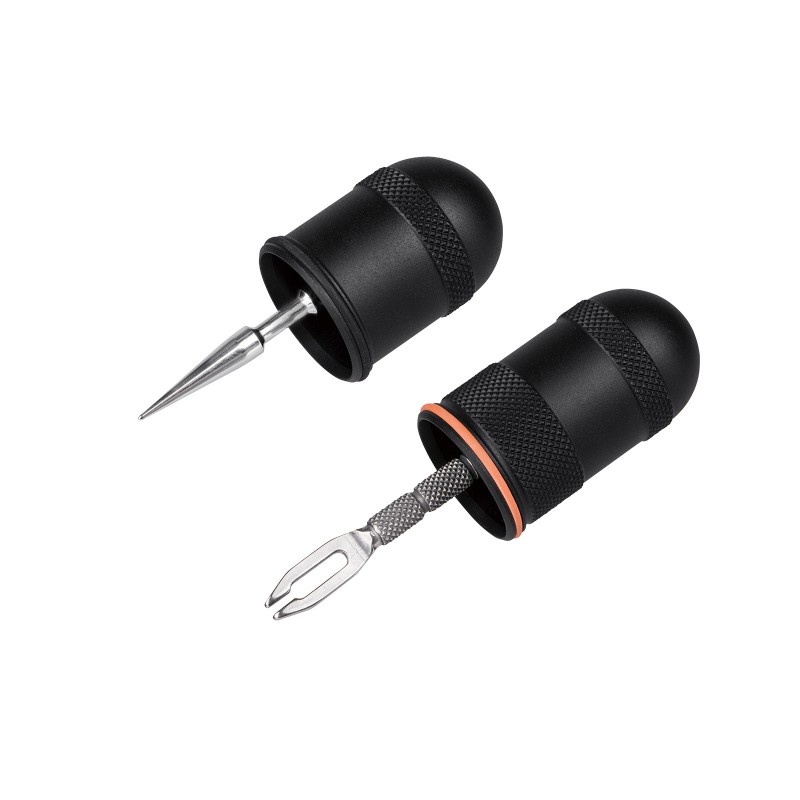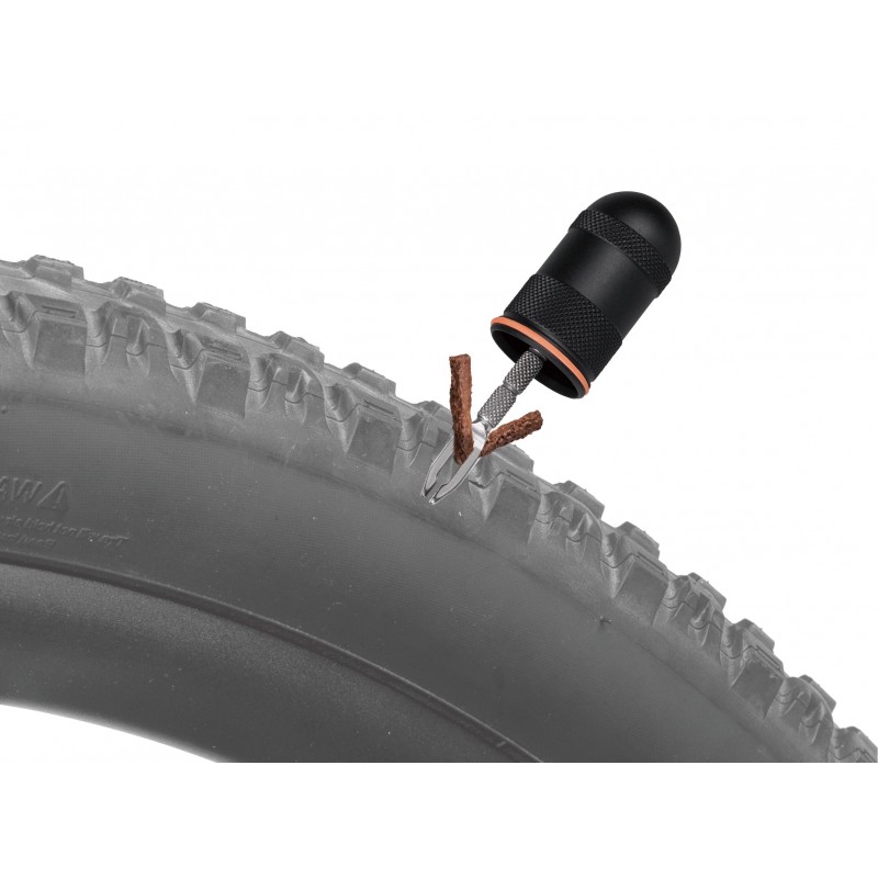 kit de reparación para neumáticos Tubeless muy minimalista. Las herramientas de reparación están integradas en las tapas de los extremos de la cápsula que cuentan con superficies que ofrecen un agarre adicional al reparar el neumático. Todo el kit se guarda dentro de una cápsula de aleación mecanizada.