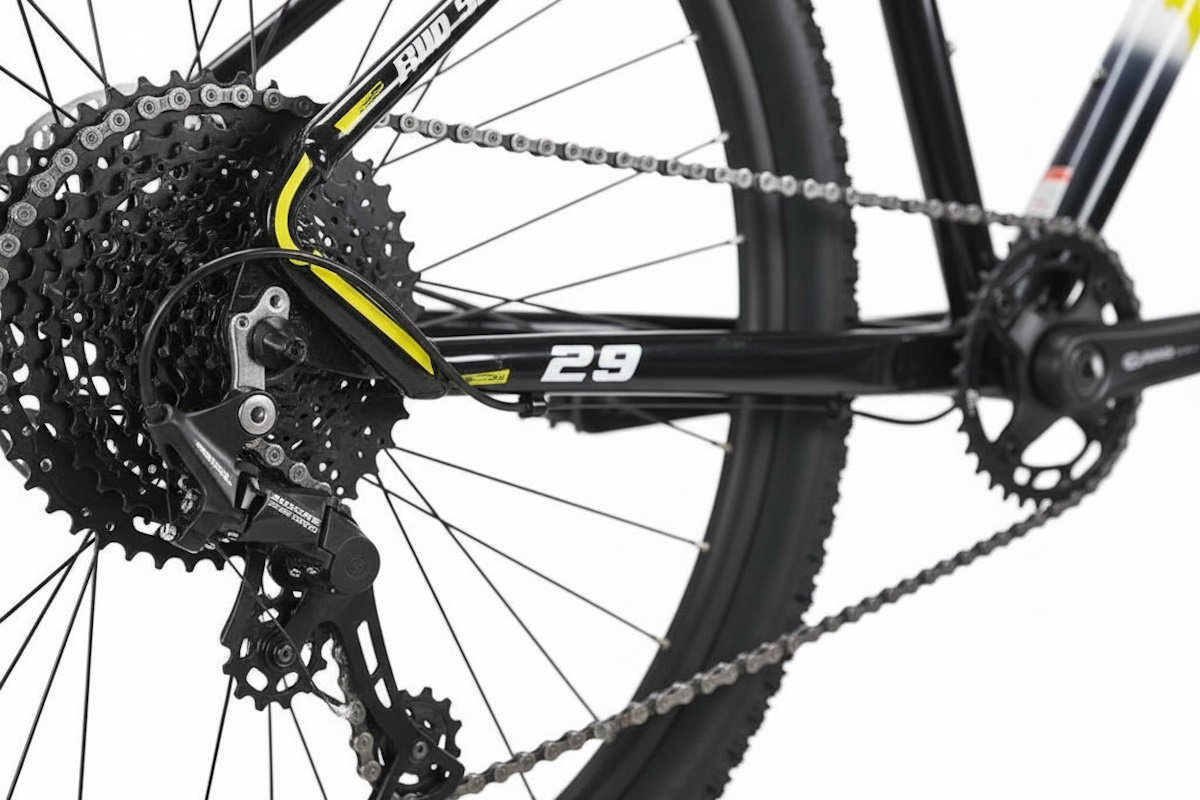 La gran protagonista es su transmisión Shimano Deore M6100 de 12 velocidades, combinada con el cassette Sunrace MZ90 11‑50T: un rango brutal para afrontar subidas duras sin renunciar a velocidad en llano. El pedalier hueco mejora la rigidez y reduce el peso, ofreciendo una pedalada más directa y eficiente.