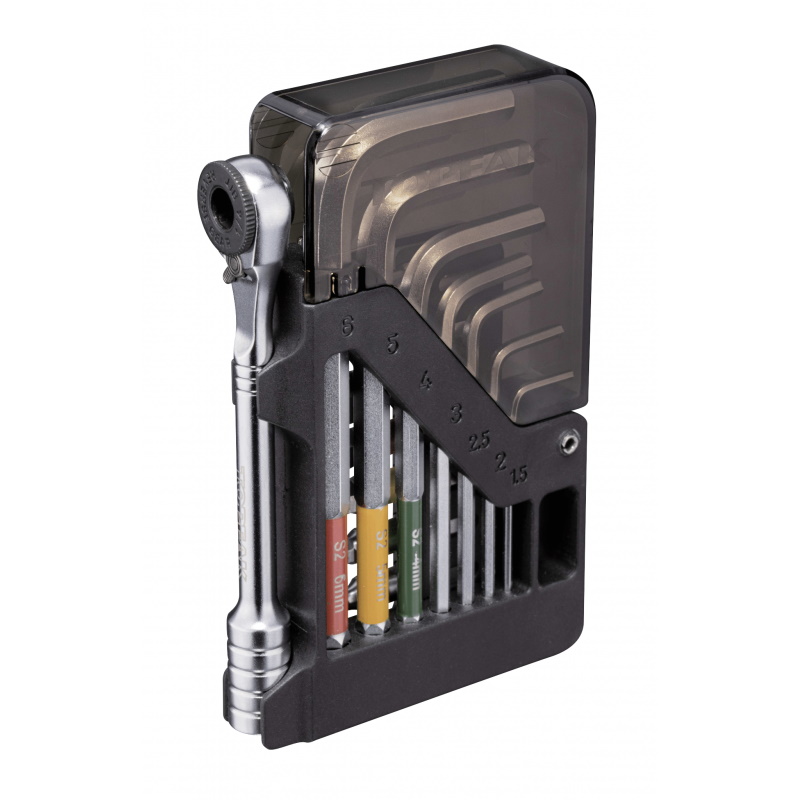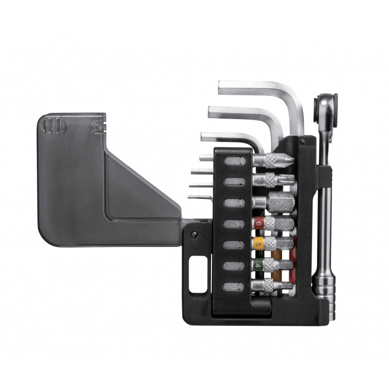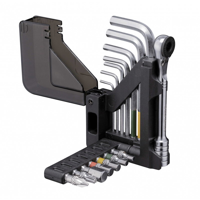 Multiherramienta de 15 funciones increíblemente compacta con una llave de carraca y un juego de llaves Allen de punta esférica. 7 brocas para la carraca y las 7 llaves Allen con punta esférica se almacenan en un innovador cuerpo plegable muy organizado lo suficientemente pequeño como para caber en un bolsillo de jersey.