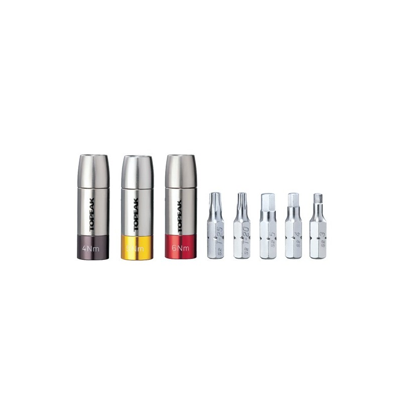 Este set de herramientas incluye Torq Sockets con valores de 4/ 5/ 6Nm que funcionan con cualquier herramienta que disponga de una llave Allen de 5 mm. Tienen un límite para no sobrepasar los valores recomendados y así no dañar ninguno de los tornillos, componentes o partes de carbono.