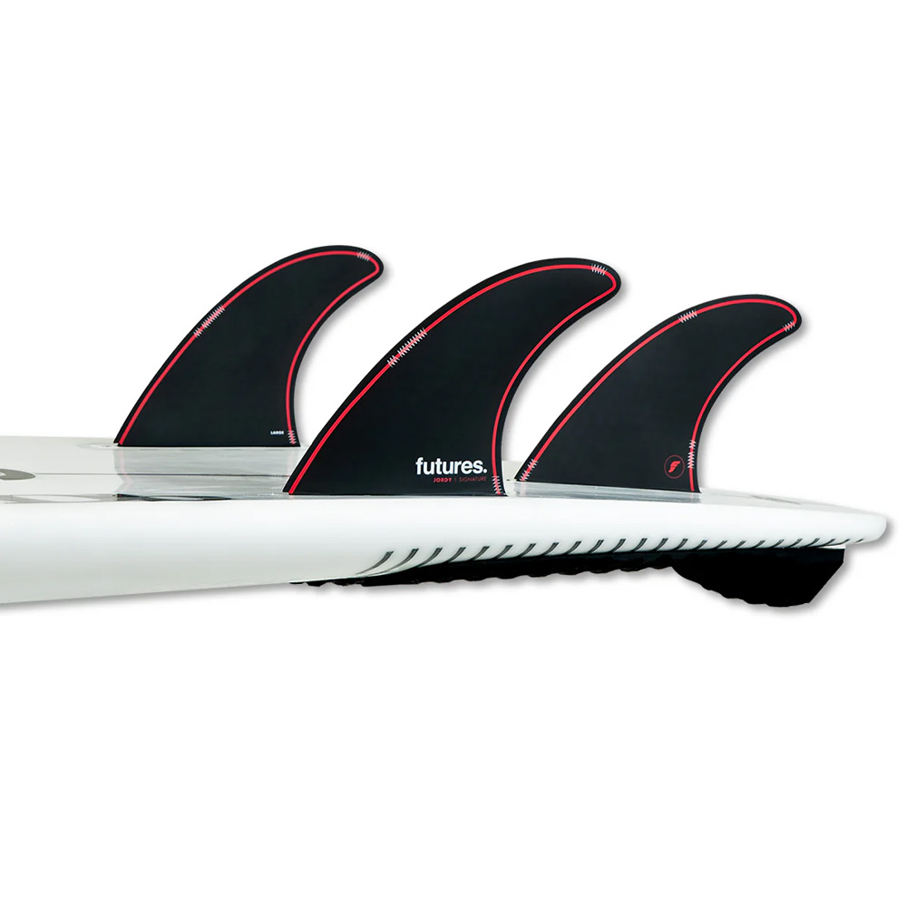 The Jordy Signature (M), designed by championship tour surfer Jordy Smith, is a large sized fin in the Rake template category. This set is the daily driver for Jordy’s assault on the World Tour. The Honeycomb construction provides a balanced flex pattern, perfectly suited for Jordy’s smooth lines. The center fin is smaller than the side fins for increased maneuverability.