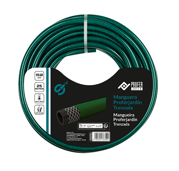 Rollo de manguera trenzada de 15 metros de largo y 15mm de diámetro exterior.
