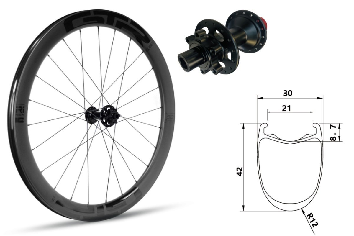 – Llanta: Carbono UD Tubeless Ready negro mate con adhesivos blanco brillante. Perfil: 42mm de altura, 21mm interior y 30mm exterior