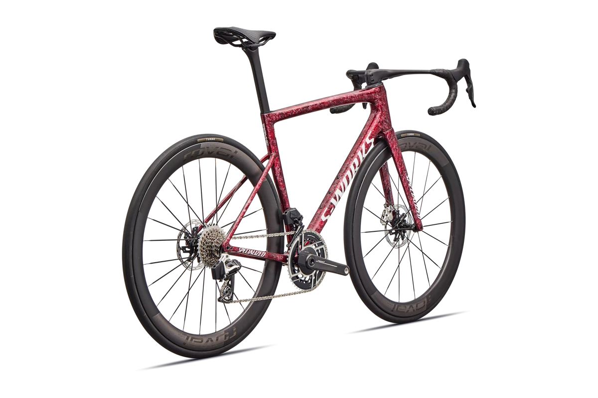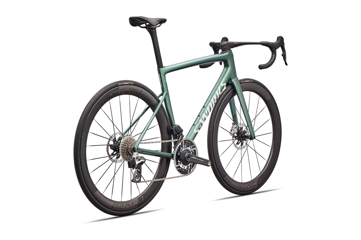 Beneficio: eficiencia aerodinámica y estabilidad delantera, con opción tubeless para optimizar rodadura y reducir pinchazos por pellizco. - Rueda trasera: Roval Rapide CLX III, Tubeless, 21mm internal width carbon rim, 48.5mm depth, Win Tunnel Engineered, Roval LF19-R hub, 24h, ARRIS MTO-255 Straight Pull Spokes (Carbon Fiber reinforced BioNylon, Ti end fittings)