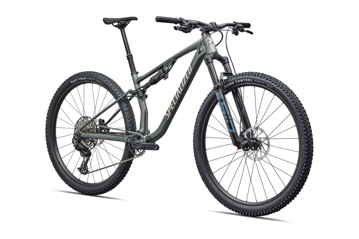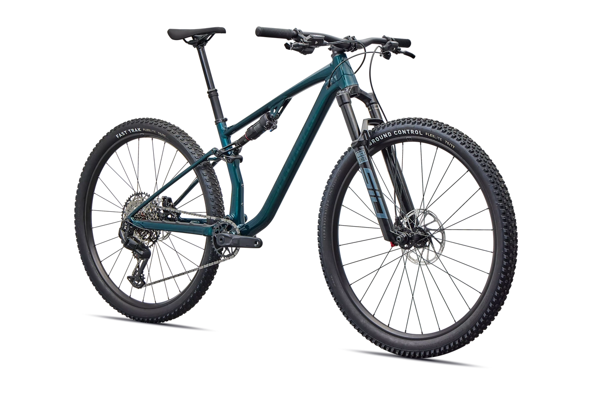 Las llantas Specialized Alloy son tubeless ready y ofrecen 27 mm de ancho interno. La combinación de neumáticos incluye Ground Control 29×2.35 delante y Fast Trak 29×2.35 detrás, ambos con carcasa Flex Lite y compuestos T5/T7, una selección pensada para equilibrar agarre delantero, velocidad de rodadura y control.