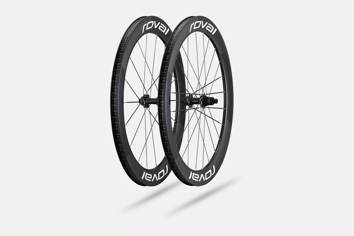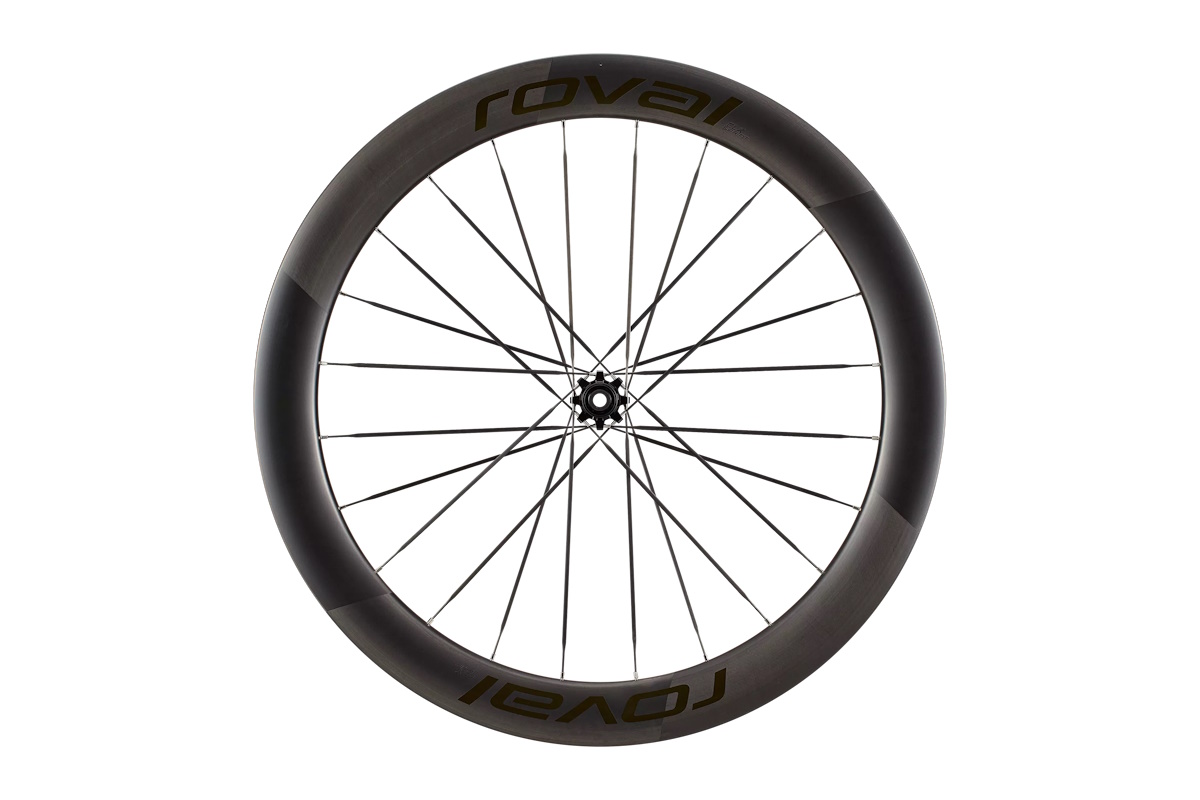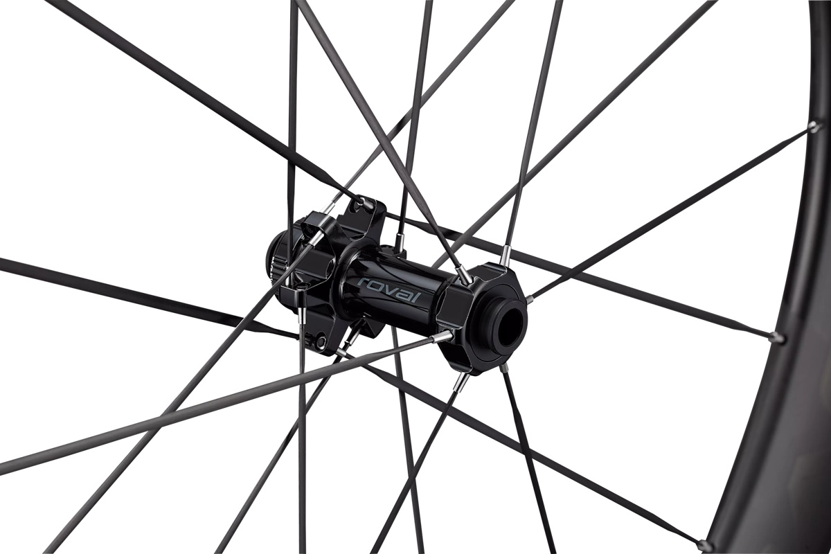 - Tecnología: Llantas de carbono clincher con gancho, compatibles tubeless y mousse, bujes Roval con componentes internos DT Swiss 180 EXP y rodamientos cerámicos DT Sinc.