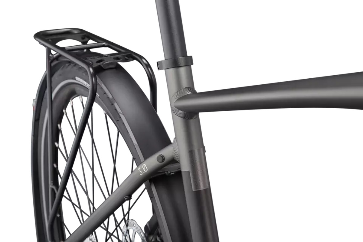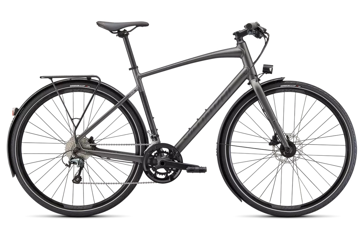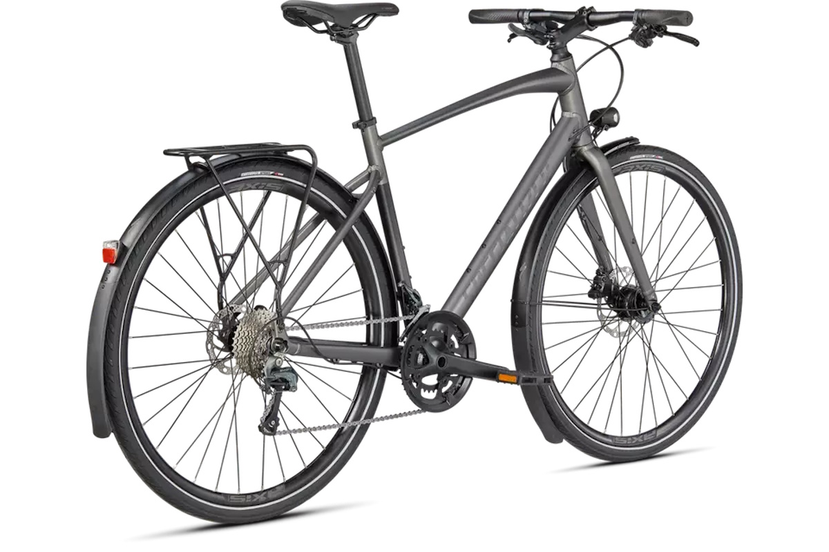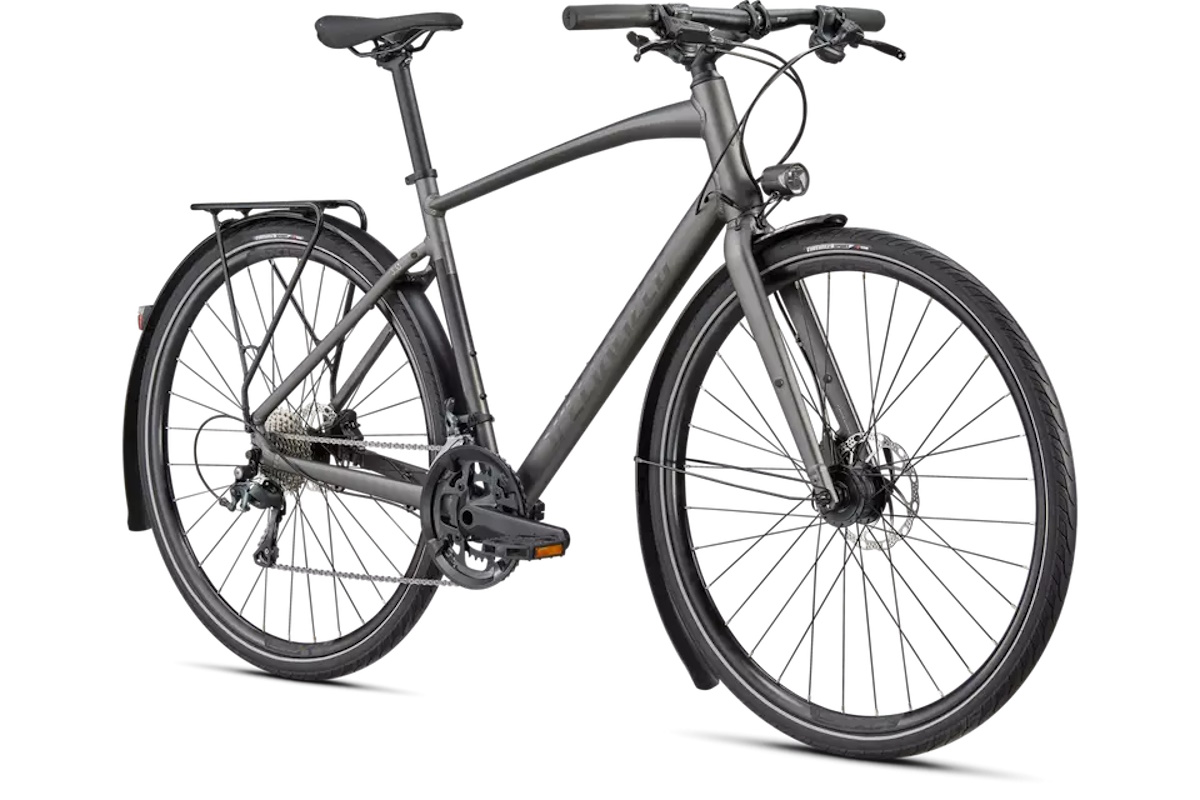 - Cuadro: Specialized A1 Premium Aluminum, Fitness Geometry, tubería butted, cableado interno, flat-mount disc, quick-release, anclajes Plug + Play para portabultos/guardabarros