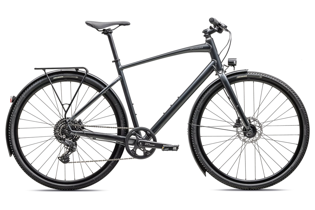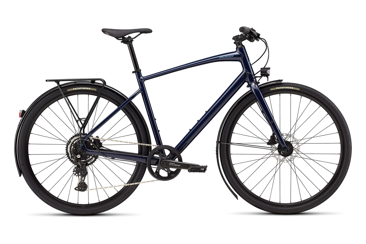 - Cuadro: Specialized A1 Premium Aluminum, Fitness Geometry, tubería butted, cableado interno, flat-mount disc, quick-release, anclajes Plug + Play (portabultos/guardabarros)