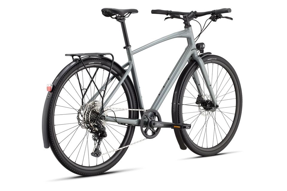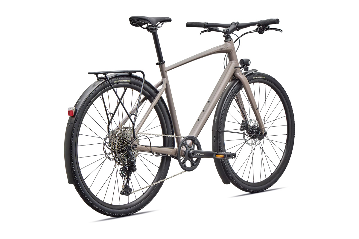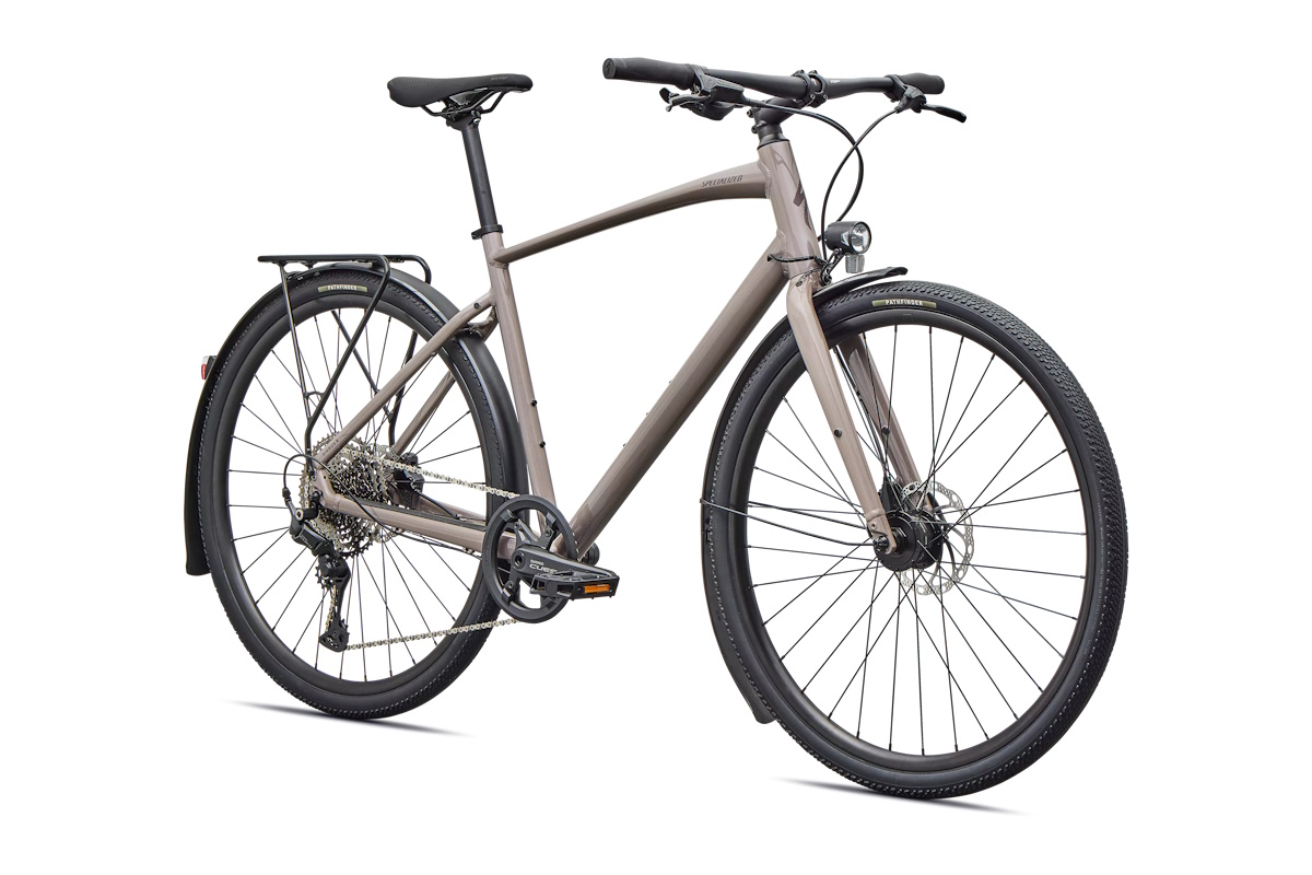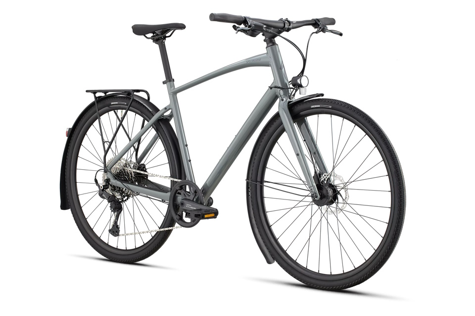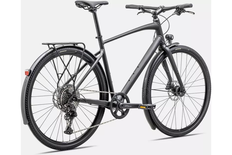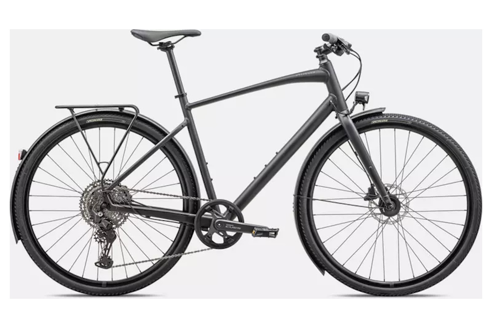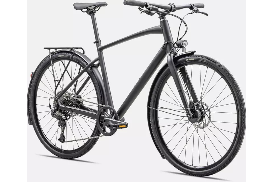 - Cuadro: Specialized A1 Premium Aluminum, Fitness Geometry, tubería butted, cableado interno, flat-mount disc, quick-release, anclajes Plug + Play (portabultos/guardabarros)