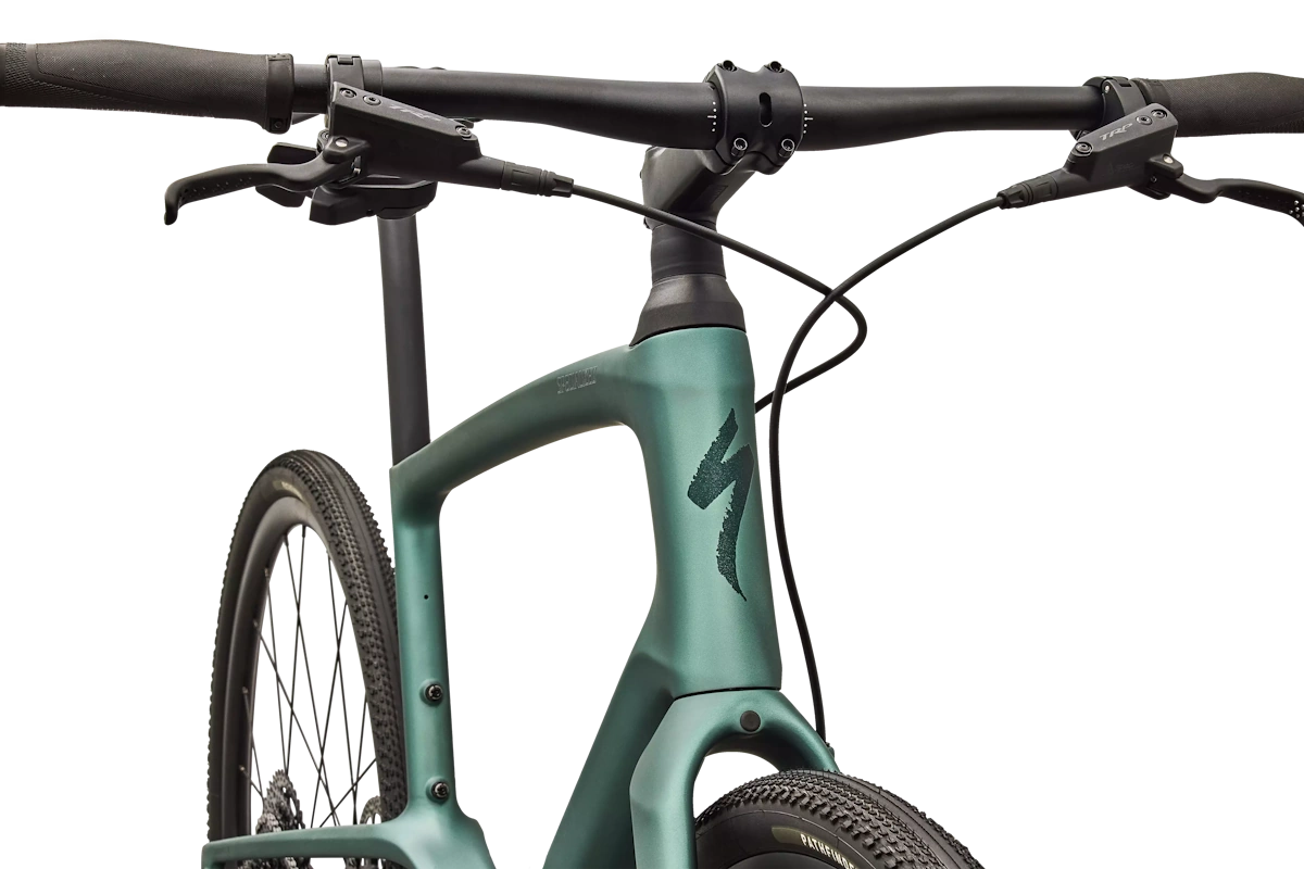 Concepto Specialized: confort y eficiencia mediante diseño de cuadro (Compliance Junction) y filtrado de vibraciones en la dirección (Future Shock), con geometría optimizada por talla (Rider-First Engineered).
