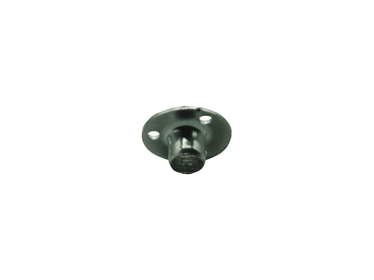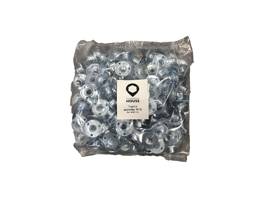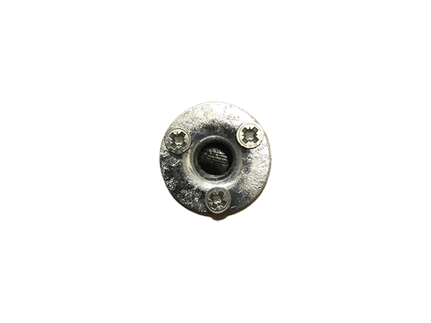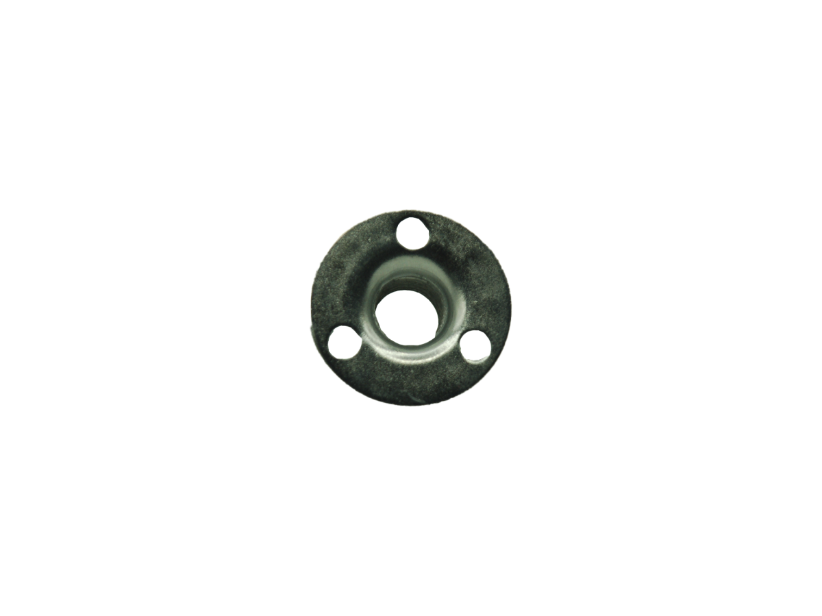 Tuerca de acero sin púas con rosca M10 para la sujeción de presas. Se atornilla por detrás con tres tornillos tirafondo 3,5×20.