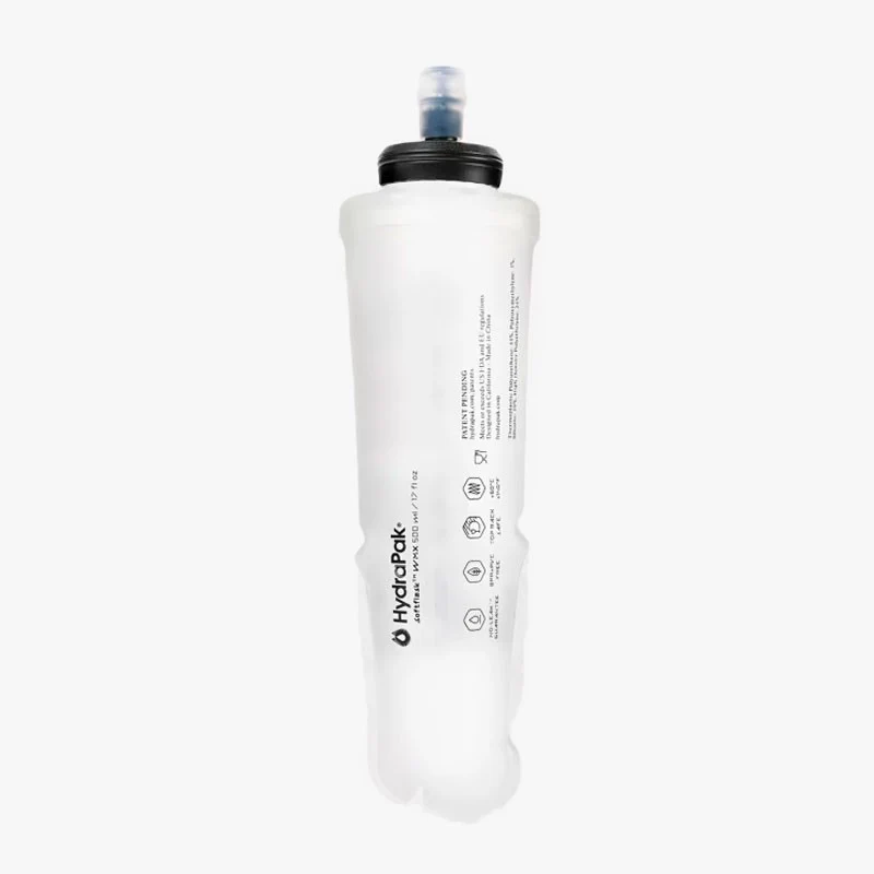 El Water Flask 500ml con válvula de mordida, para contener agua, bebidas energéticas o geles. Tiene una tapa más grande ideal para meter cubitos de hielo, se cierra con 1/4 de vuelta. Con un tapón adicional para cuando necesitas guardarlo en la mochila.